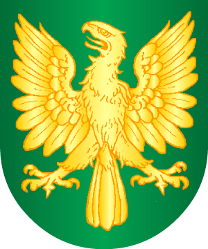 de sinople y dos lobos de sable atravesados al tronco. Bordura cosida, de oro,