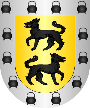 engolada en cabezas de dragones de sinople y acompañada de dos lobos