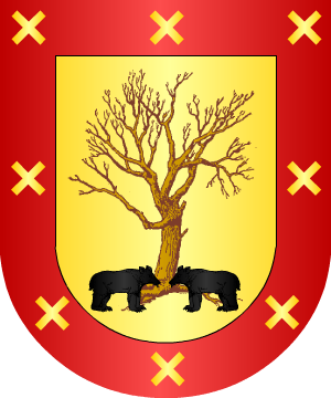 con un jabalí de sable pasante al pie del tronco. Bordura de gules, con