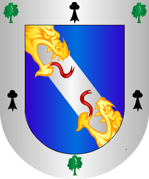 traen: Escudo cuartelado: 1º, de sinople, con dos columnas, de plata, sobre