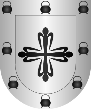 calderas de sable. 12.- Don Felipe II concedió al Capitán Diego Caro, conquistador de Indias, estas otras armas: En campo de azur, un castillo de oro, cercado de una muralla de plata, puesto en aguas de azur y plata y acostado de dos leones rampantes de oro, surmontados de dos águilas mitad de sable mitad de oro y con las patas también de oro. De la torre de homenaje del castillo sale un brazo armado, de plata, sosteniendo una bandera de sinople con el asta y lanza de oro y cargada de una estrella de este jefe, de oro, partido de lo mismo: en su primera partición un escudete de azur con dos mesas o tablas de oro, cargadas cada una de tres panelas de sable, y bordura de oro, con tres espadas desnudas de plata con la guarnición de sable, y en la segunda partición otro escudete de plata, con una cruz floreteada de sable, y bordura cosida de plata, con ocho calderas de sable. Bordura general de gules, con diez hachas de plata con el mango de oro. (Reproducimos únicamente el escudo mencionado más abajo) 12.- Las armas que contiene el segundo escudete del jefe son las mismas que tomaron los caballeros Caro que asistieron a la batalla de las Navas de Tolosa. Información de estos linajes complementada por cortesía de blasonari.net |