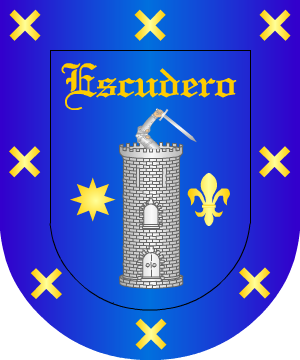 19.- Los originarios de Osuna (Sevilla), radicados en Sevilla y Jerez de la Frontera (Cádiz), según Vicente de Cadenas, usan: En campo de azur, saliente del flanco siniestro, un brazo armado, de oro, empuñando una espada del mismo metal, con la divisa "Sin dolo", en letras de sable. 20.- Los Escudero de Baeza y otras poblaciones andaluzas, que Pedro Lezcano hace dimanar del linaje Argote, según se explicó en anteriores líneas, ostentan, en opinión de ese tratadista, escudo de gules, con una cruz de veros de azur y plata. 21.- Los originarios de Baltar (Orense) y radicados en Cuba, Argentina y Puerto Rico, según Vicente de Cadenas, traen: En campo de sinople, una torre, de oro, resaltada de una banda, de gules, cargada de tres armiños, de plata. 22.- Los radicados en Castrogonzalo (Zamora), según Vicente de Cadenas, usan: En campo de oro, un sauce, de sinople, sobre ondas de azur y plata. 23.- En el expediente del Guardia Marina Luis Suazo Mondragón y Ximénez de Cisneros, nacido en La Coruña en 1759, año 1776, constan: En campo de gules, cinco calderas de sable, puestas en aspa. Bordura de oro cargada de ocho aspas de gules. 24.- Otros: En campo de plata, tres fajas de gules, y entre ellas, seis panelas de gules, puestas tres y tres. 25.- Otros de Aragón, según el Conde de Doña Marina, traen: Escudo cortado en punta: jefe y abismo de azur con un castillo de plata surmontado de siete estrellas de oro. Punta de gules, con una venera de oro. 26.- Juan Baños de Velasco da también como propio de otra familia Escudero este escudo cortado: La partición alta, de azur, con un escudete de sinople, cargado de tres bandas de plata, acompañado de dos cipreses de su color y surmontado de un castillo de plata, que, a su vez, está surmontado de cinco estrellas, también de plata, en semicírculo. A los lados del castillo tres saetas con las puntas de hierro, el asta de oro y las plumas de plata, atadas con una cinta de gules. La partición baja, de oro, con cinco flores de lis, de azur, puestas en palo al lado derecho, y cinco cabezas, de lobo, de sable, puestas también en palo, al lado izquierdo, y en el centro cinco veneras de plata y sable, igualmente en palo. En situación de orla, el cordón de San Francisco de plata con perfiles de sable. Complemento de información de estos linajes por cortesía de blasonari.net |