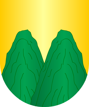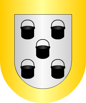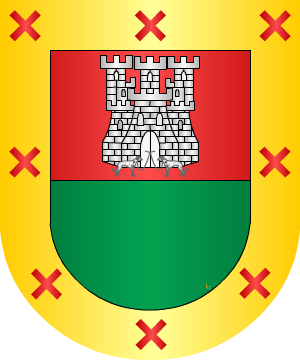estas armas: En campo de oro, un castillo de púrpura sobre ondas de agua