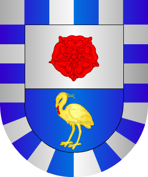 También usan: Cortado: 1º, en plata, una rosa de su color y 2º, en azur, una garza de oro picándose el corazón, del que brotan gotas de sangre. Bordura de veinticuatro jaqueles de plata, y azur (asturiano). (Ref.: GARCIA CARRAFA). |