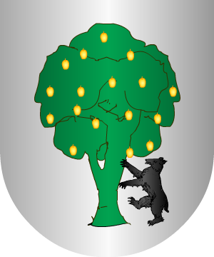 En oro, un árbol, arrancado, de sinople, con dos lobos, de sable, pasantes. (Ref.: CADENAS). |