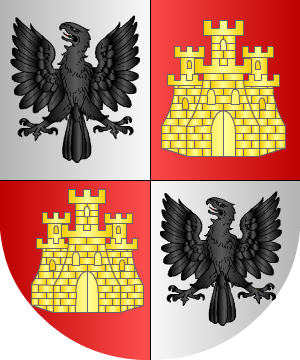 13.- Otros: Escudo cuartelado: 1º y 4º, en campo de plata, un águila de sable, y 2º y 3º, en campo de gules, un castillo de oro.