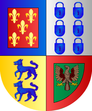 castillo de piedra, aclarado de azur, y a su puerta, un lobo de sable con un
