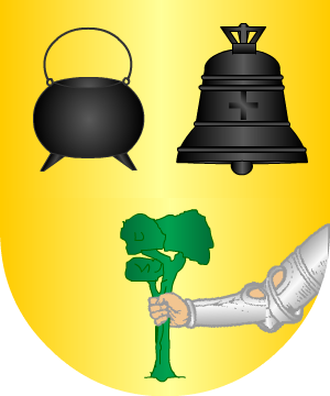 un brazo armado; en jefe, una campana de sable, entre dos calderas del mismo