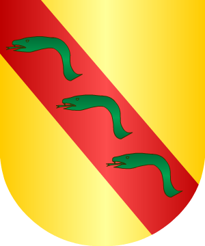 de oro, coronado del mismo metal y colocado bajo la puerta. Bordura de plata,