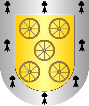 gules, con dos calderas de sable, y, en cada uno de sus cuatro ángulos,
