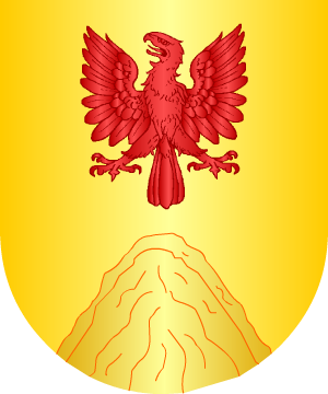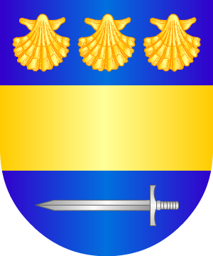 traen: En campo de gules, un león de oro, fajado de azur. Bordura de