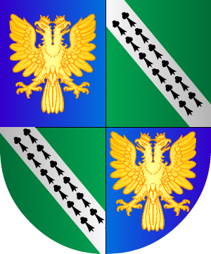 azur, con cinco escudetes de oro, cargados de cinco roeles de azur, puestos