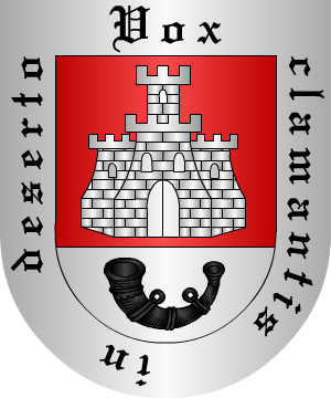 Valentín, en 1609, y Rafael Valentín, en 1673. Armas 1.- Los Valentín, de Aragón, según el Conde de Doña Marina y Gregorio García Ciprés, traen: En campo de gules, un castillo, de plata. Punta de plata, con una bocina, de sable. Bordura de plata, con esta leyenda en letras de sable: "Vox clamantis in deserto". 2.- Los Balentín, traen: Escudo cortado: 1º, partido: primero, en campo de plata, tres volcanes, en erupción, y segundo, en campo de plata, un hombre armado con una maza en la mano, mirando a un torre de piedra, colocada a la diestra, y sumada de un dragón de sinople, y 2º, en campo de azur, once flores de lis de plata, puestas tres, cinco y tres. 3.- Los Balentín, de Navarra, según Diego Ramírez de Avalos de la Piscina, traen: En campo de gules, un castillo, de plata. Punta de plata, una bocina, de sable. Bordura de plata, con esta leyenda en letras de sable: "Vox clamantis in deserto". 4.- Otros Valentín, según Miguel de Salazar, traen: En campo de gules, un castillo, de plata, sobre campaña de plata, cargado de una bocina, de sable. Bordura de plata, con esta leyenda en letras de sable: "Vox clamantes in deserto". 5.- Los Valentín, de La Rioja, según Julio de Atienza, traen: En campo de sinople, tres castillos, de plata, aclarados de sable y bien ordenados. 6.- Los Valentín, radicados en Alicante, según Vicente de Cadenas, traen: En campo de plata, una torre cuadrada, almenada y mazonada, de sable, acompañada de seis flores de lis, de azur, puestas tres y tres a cada lado, en palo. 7.- Otros Valentín, traen: En campo de oro, un topo, de sable. 8.- Otros Valentín, traen: En campo de sinople, una corcesca, de oro y la borla de gules. 9.- Otros Valentín, traen: En campo de azur, medio vuelo, de plata; bordura de gules con ocho veneras, de plata. 10.- Otros Valentín, traen: En campo de plata, una faja, de gules, resaltada de un brazo armado, de plata, sumado de una espada, también de plata. 11.- Los de Allègre (Francia) traen: En campo de azur, un chevrón, de oro, acompañado de tres bezantes del mismo metal; el jefe de gules, con tres cruces, de plata Información complementada por cortesía de blasonari.net Bibliografía Diccionario Heráldico y Genealógico de apellidos españoles y americanos de Alberto y Arturo García Carraffa. Diccionario Hispanoamericano de Heráldica, Onomástica y Genealogía de Endika de Mogrobejo. Repertorio de Blasones de la Comunidad Hispánica de Vicente de Cadenas y Vicent. Armorial de Aragón del Conde de Doña Marina. Diccionario Heráldico y Nobiliario de los Reinos de España de Fernando González-Doria. Heraldario Español, Europeo y Americano de Ampelio Alonso de Cadenas y López y Vicente de Cadenas y Vicent. Diccionario Heráldico de Gregorio García Ciprés. Nobiliario Español de Julio de Atienza, Barón de Cobos de Belchite. |