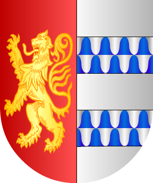 de peregrino de plata, puestos en palo, acostados. Bordura de oro con cinco