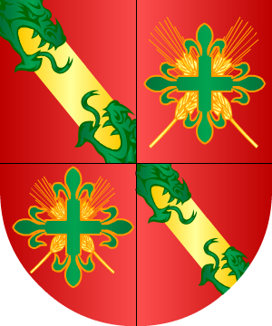 al pie del árbol. 16.- Otros, según Juan José Vilar y Psayla, traen: En campo de gules, una banda de oro con dragantes del mismo metal, lampasados de gules, y en la parte superior un brazo armado que sostiene una bandera de diferentes colores, con medias lunas moriscas de plata, y en la parte baja un árbol de sinople, salpicado de oro, con una lanza arrimada al mismo, y un caballo blanco embridado y ensillado. 17.- Los Benítez de Lugo, originarios de Garachico (Tenerife), según Vicente de Cadenas, traen: Escudo cuartelado: 1º y 4º, en campo de gules, una banda de oro, engolada en dos dragantes, de sinople, y 2º y 3º, en campo de gules, dos espigas, de oro, puestas en aspa y resaltadas de una cruz flordelisada, de sinople. 18.- Antonio Benítez de Lugo y de la Cantera, nacido en La Habana el 7 de Octubre de 1857, Caballero de la Orden de Santiago desde 1883, primer Marqués de Santa Susana concedido el 27 de Febrero de 1893, en atención a los méritos y servicios de su tía Susana Benítez y Pérez de Abreu, ilustre benefactora, que fundó asilos y colegios en La Habana para ancianos y niñas pobres, usaba por armas: Escudo cuartelado: 1º y 4º, en campo de gules, una banda de oro, engolada en dragantes, de sinople, que es de Benítez, y 2º y 3º, en campo de gules, dos espigas, de oro, puestas en aspa, y resaltadas de una cruz flordelisada, de oro, vacía de sinople, que es de Lugo. 19.- Los apellidados Benítez de Tena, radicados en La Paz (Bolivia), usan: En campo de sinople, una banda, de sable, cargada de cuatro garras de águila, de oro. Información de estos linajes complementada por cortesía de blasonari.net |