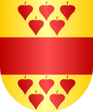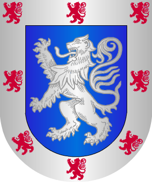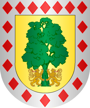 de sable. 31.- En el expediente del Caballero de la Orden de Alcántara de Pedro Nicomedes Campos de Orellana y Calvo, natural de La Haba (Badajoz), año 1861, constan las siguientes armas: Escudo partido: 1º, en campo de sinople, tres barras curvas de gules, y 2º, en campo de azur, diez roeles de oro. 32.- En la calle de los Aranda, de la ciudad de Granada, constaban las siguientes armas: Un árbol terrasado y dos leones rampantes contramirándose. Bordura con dieciocho losanges. 33.- Los de Granada, según Francisco Fernández de Béthencourt, traen: En campo de oro, un árbol terrasado de sinople, atravesado de dos zorras de su color natural, andantes, la primera contornada, al pie del tronco. 34.- Otros, en Portugal, tienen: En campo de azur, tres cabezas de león de oro degolladas, lampasadas de gules y puestas en triángulo mayor. 35.- Los radicados en Punta Arenas (Chile), según Vicente de Cadenas, usan: En campo de oro, un árbol, de sinople, con dos leones, de gules, empinados a su tronco. Bordura de plata con siete cabezas de moro. Divisa: "Campi tui replebuntur ubertate". 36.- Finalmente, diremos que en Flandes tuvo asiento una familia de este apellido, cuyas armas se organizan así: En campo de plata, tres fajas de gules brochantes sobre ellas, tres barras del mismo color. Complemento de información de estos linajes por cortesía de blasonari.net |
