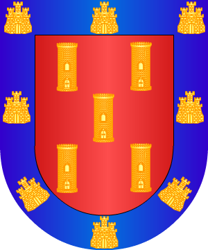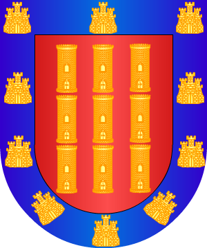 Bordura de plata, con ocho sotueres de gules. 19.- La rama de León, dimanada también del solar de la Merindad de Bureba, tiene estas otras armas: En campo de plata, un árbol de sinople, terrasado de lo mismo y acompañado de cinco cabezas de moro degolladas y con turbantes de azur, puestas: dos en los cantones del jefe, dos en los flancos y una en punta, al pie del tronco del árbol. Bordura de azur, con ocho flores de lis de plata, y en la parte superior de esta bordura, entre las flores de lis, otras dos cabezas de moros degolladas y con turbantes de plata. 20.- Los Campos, de Canarias, originarios de Portugal, usan: En campo de sinople, un castillo de plata, acompanado de cinco estrellas del mismo metal. 21.- Los Campos de Galicia tienen las mismas armas que los Hernández y Fernández del Campo que radicaron en las comarcas de Sequeros y Ledesma, de la provincia de Salamanca. Dichas armas se organizan así: En campo de azur, un sotuer de oro, acompañado de cuatro flores de lis del mismo metal. Bordura de plata, con ocho crecientes de azur. 22.- Otros Campos de Galicia, según Cotarelo, traen: Siete escaques, de sinople, alzados, y ocho de oro, en campo de azur. Descripción que pugna con las leyes de la Heráldica. Acaso quiso decir estas otras armas: Siete jaqueles de gules, alzados sobre ocho hundidos, de oro. 23.- En el Palacio Campos, del barrio de Traña, de la anteiglesia Abadiano, junto a un escudo de Muncharaz, constan las siguientes armas para los Campos: Escudo cortado: 1º, un castillo con una torre del homenaje, y a sus lados dos banderas, y 2º, cinco cabezas de moro degolladas y con turbantes. 24.- Los originarios de Corella (Navarra), según Vicente de Cadenas, traen: Escudo partido: 1º, en campo de gules, un león rampante, de oro, y 2º, en campo de oro, una cruz, de gules. 25.- La casa de Campos en Teruel y sus ramas de Zaragoza, Daroca y Valdecuenca, traen: En campo de azur, un león rampante de plata, y bordura de plata, con ocho leones rampantes de gules. 26.- Los de Mallorca usan: En campo de oro, un ramo de lirio, con su tronco y hojas de sinople. 27.- Los de Becerril de Campos y sus ramas traen: En campo de gules, nueve torres de oro, puestas en tres fajas y bordura de este mismo metal, con ocho castillos de azur. 28.- Otros ponen nueve torres o castillos de plata en campo de gules y bordura de azur, con diez castillos de oro. 29.- Las Campos de Praves y Las Pilas (Cantabria), ponen solamente cinco torres en sotuer en el campo del escudo y ocho castillos en la bordura. 30.- La casa de Don Benito, en Extremadura, trae: Escudo partido: