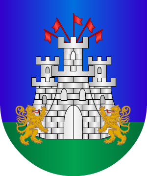 de gules, sobre rocas de plata, con un banda, de sable, que sale por la puerta.