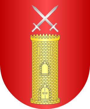 traen: En campo de gules, una torre de plata, y bordura de plata con cinco armiños