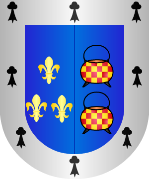 de lis, de oro, mal ordenadas, y 2º, en campo de azur, dos calderas jaqueladas,
