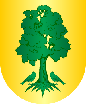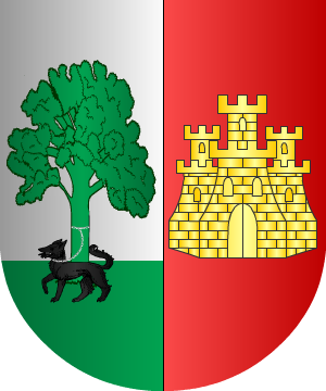 Castellano. Armas De oro, dos lobos andantes de sable, y diez calderas de lo mismo puestas en orla. |
