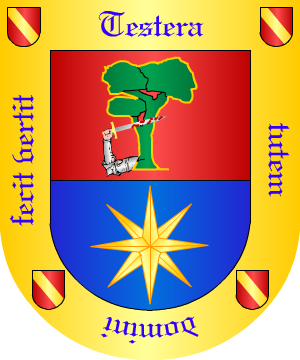 De origen gallego. Armas De plata, cinco correas de gules puestas en banda, con cabos tachones y hebillas de oro. |