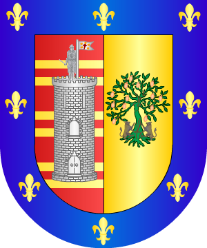 Las casas de la Montaña de León y de Burgos, ostentaron escudo partido: 1.º, con tres fajas de oro cargada cada una de un ceñidor de gules, y brochante sobre estas piezas, una torre, de plata, en cuyo homenaje hay un guerrero armado, de plata, con una espada desnuda del mismo metal en la mano diestra y una bandera de plata en la siniestra, bandera que está cargada de una cruz de gules, como la de Santiago, acompañada de cinco estrellas de oro, dos a cada lado y otra en la parte superior, y 2.º, de oro, con un olivo de sinople frutado y dos becerros de su color natural empinados al tronco. Bordura general de azur con ocho flores de lis de oro. (Ref.: GARCIA CARRAFA) |