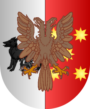 En azur, un castillo, de oro, almenado, mazonado de sable y atado a su puerta ¿un perro? de su color. (Ref.: CADENAS) |