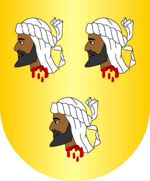 Asturiano. En gules, un león de oro, andante, que lleva en la mano una bandera de plata. Bordura cosida de azur, con cuatro áncoras de plata. (Ref.: CADENAS). |