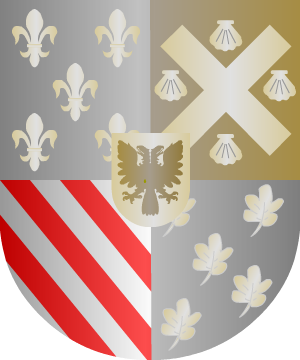 Armas Cuartelado: 1º y 4º, en gules, un escudete de plata cargado de tres fajas de azur, y 2º y 3º, en oro, un lobo de gules, pasante. (Ref.: CADENAS). |