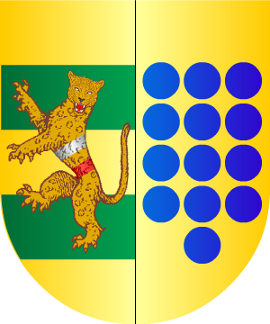 Armas En oro, un barco, de sable, surmontado de un delfín, de plata. (Ref.: CADENAS). |