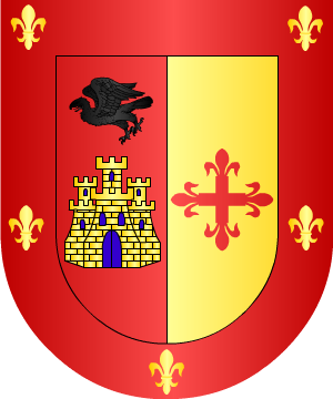 Armas Partido, de gules un castillo de oro aclarado de azur superado de un águila volante de sable, y de oro, una cruz flordelisada de gules. Bordura de gules con cinco flores de lis de oro. (Ref.: GARCIA CARRAFA). |