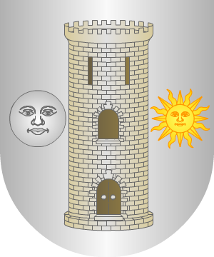 Armas En plata, una torre, de su color, acompañada de una luna a la diestra y de un sol a la siniestra. (Ref.: CADENAS). |