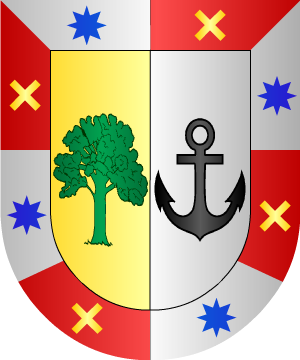 Armas En oro, un roble de sinople, partido de plata, con un áncora de navío, de sable. Bordura componada, de ocho piezas; cuatro de gules, con un aspa de oro, y cuatro de plata, con una estrella de azur. (Ref.: CADENAS). |