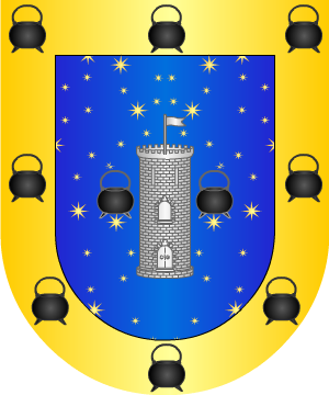 Asturiano. Armas En oro, un castillo de piedra y dos lobos, de sable, empinados a sus muros, uno a cada lado. (Ref.: CADENAS). |