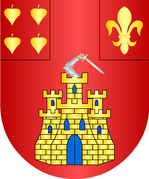 En campo de gules un castillo de oro, aclarado de azur y saliendo de la torre del homenaje, un brazo armado, de plata, con una espada en la mano; en el cantón diestro del jefe, cuatro panelas de oro, puestas en dos palos, y en el cantón siniestrado, un flor de lis del mismo metal. (Ref.: ATIENZA), (ref.: GONZALEZ-DORIA), (ref.: CADENAS). |