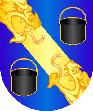 En azur, una banda de oro, engolada en cabezas de dragones de lo mismo, y acompañada de dos calderas de sable, perfiladas en oro, una a cada lado. (Ref.: CADENAS) |