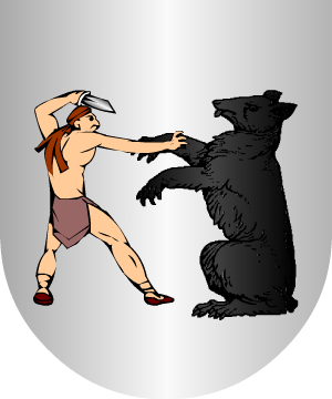 En plata, una caldera, pendiente de una cadena de azur y puesta sobre una hoguera; partido también de plata, con dos lobos de sable, el uno sobre el otro. (Ref.: CADENAS). |