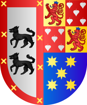 Parti: au 1, d'argent, à deux loups de sable, l'un sur l'autre, à la bordure de gueules, ch. de huit flanchis d'or (Lopez); au 2, écartelé: a. et d. d'or au lion de gueules, armé, lampassé et couronné d'azur (Suasso); b. et c. de gueules à cinq panelles d'argent, 2, 1 et 2, les tiges en haut (Hurtado de Mendoza). (Ref.: RIETSTAP). |