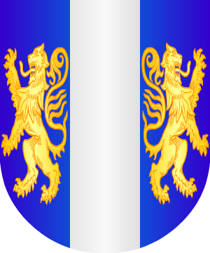 superada de una corona y un arco iris y debajo cinco dados, cuatro de gules