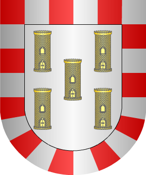 6.- Los de Castilla, según Francisco Fernández de Béthencourt, y los de Canarias, Jaén y Murcia, usan: En campo de gules, cinco torres de oro, puestas en sotuer. Dichas armas constan en la iglesia de Santa María de la Fuente, de Guadalajara.